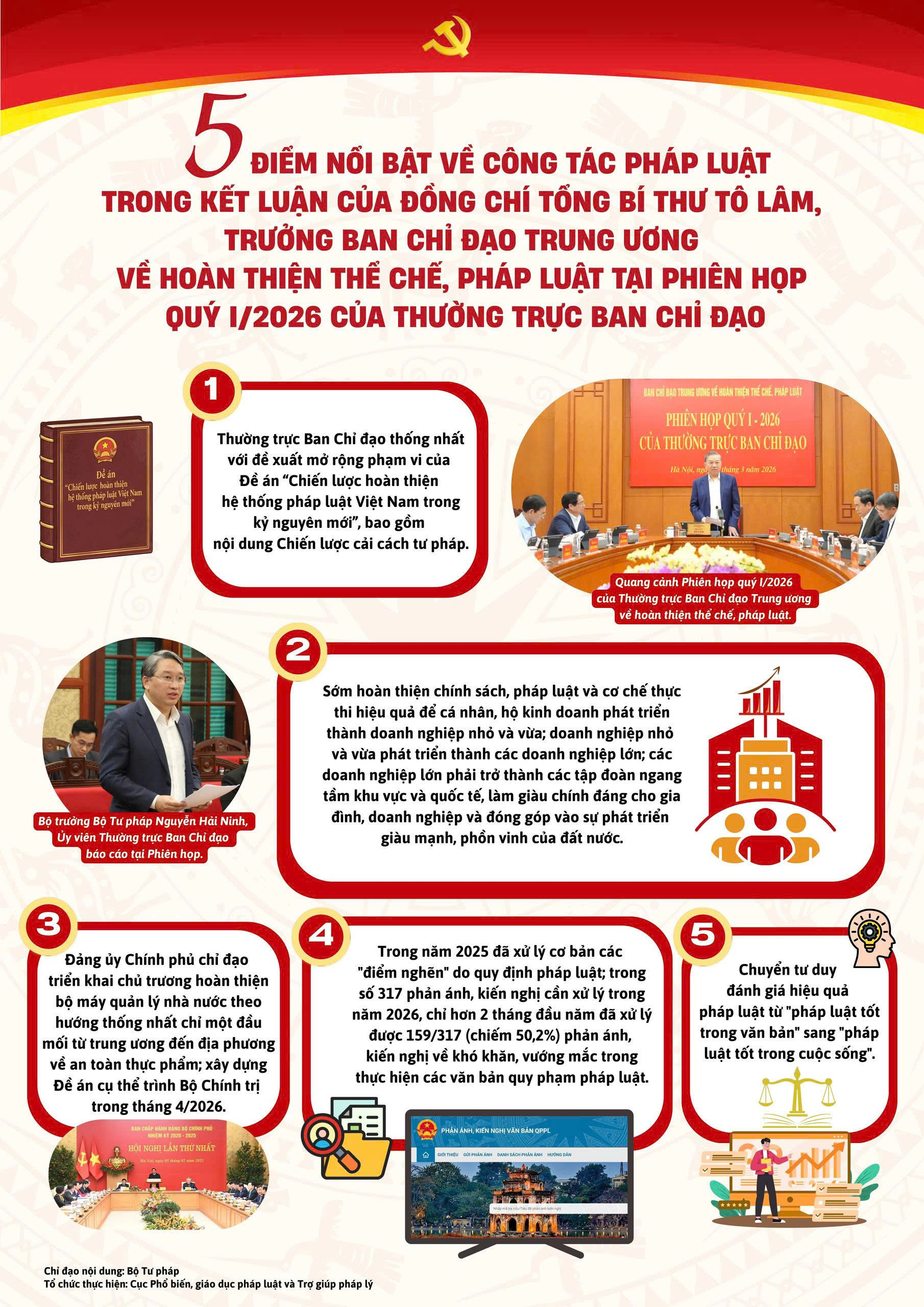 Trước đó, ngày 11/3/2026, Tổng Bí thư Tô Lâm, Trưởng BCĐ TƯ về hoàn thiện thể chế, pháp luật chủ trì Phiên họp quý I/2026 của Thường trực Ban Chỉ đạo để thảo luận, cho ý kiến đối với 5 nội dung trọng tâm, gồm: