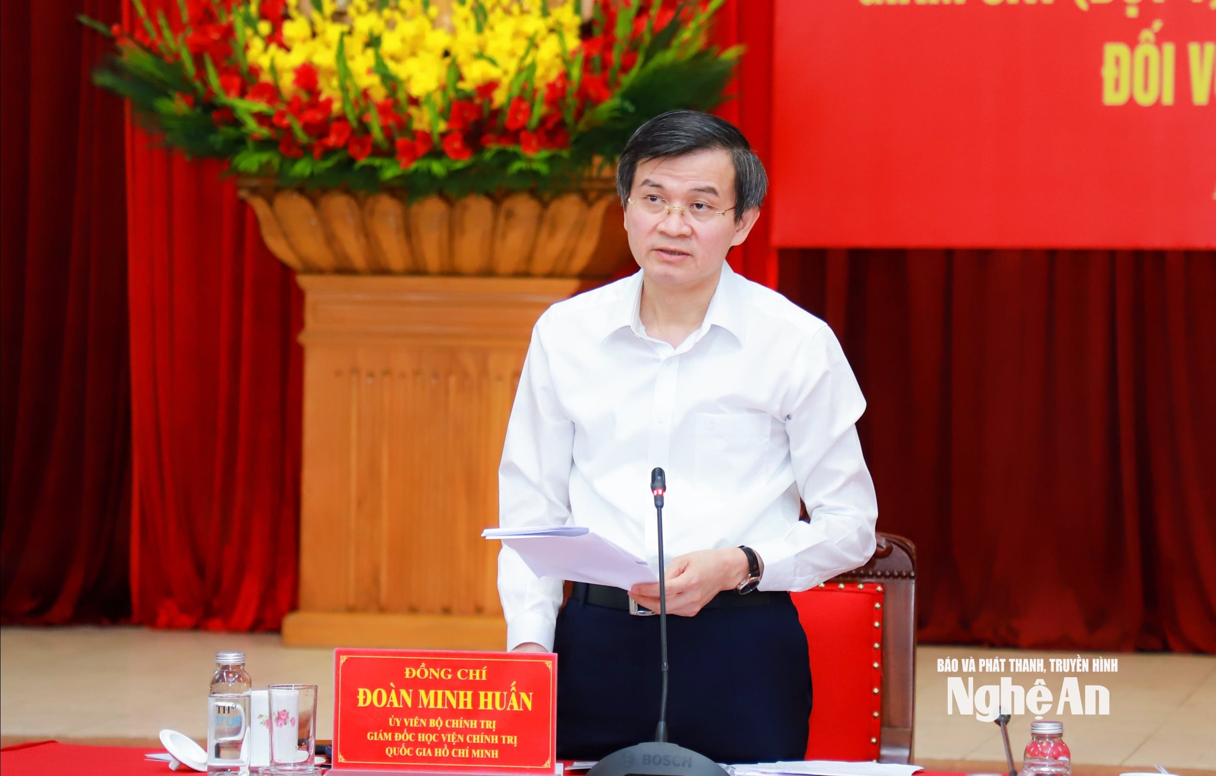 Kết luận hội nghị, đồng chí Đoàn Minh Huấn - Ủy viên Bộ Chính trị, Giám đốc Học viện Chính trị Quốc gia Hồ Chí Minh, Trưởng đoàn kiểm tra, giám sát ghi nhận và đánh giá cao Ban Thường vụ Tỉnh ủy Nghệ An đã nghiêm túc chấp hành các quy trình, kế hoạch kiểm tra, giám sát, góp phần hoàn thành nội dung giám sát đợt 1 đúng quy định, bảo đảm chất lượng.