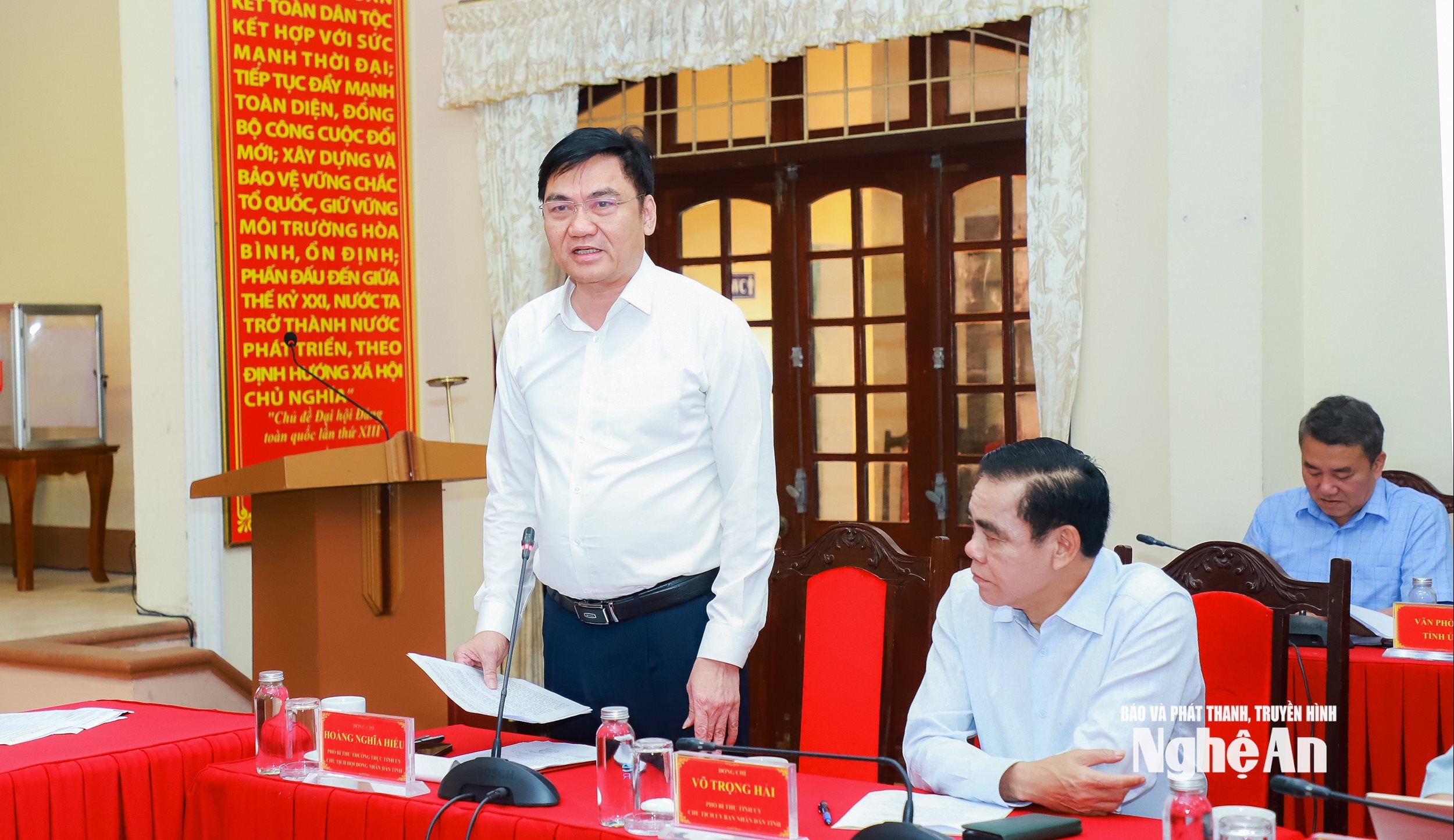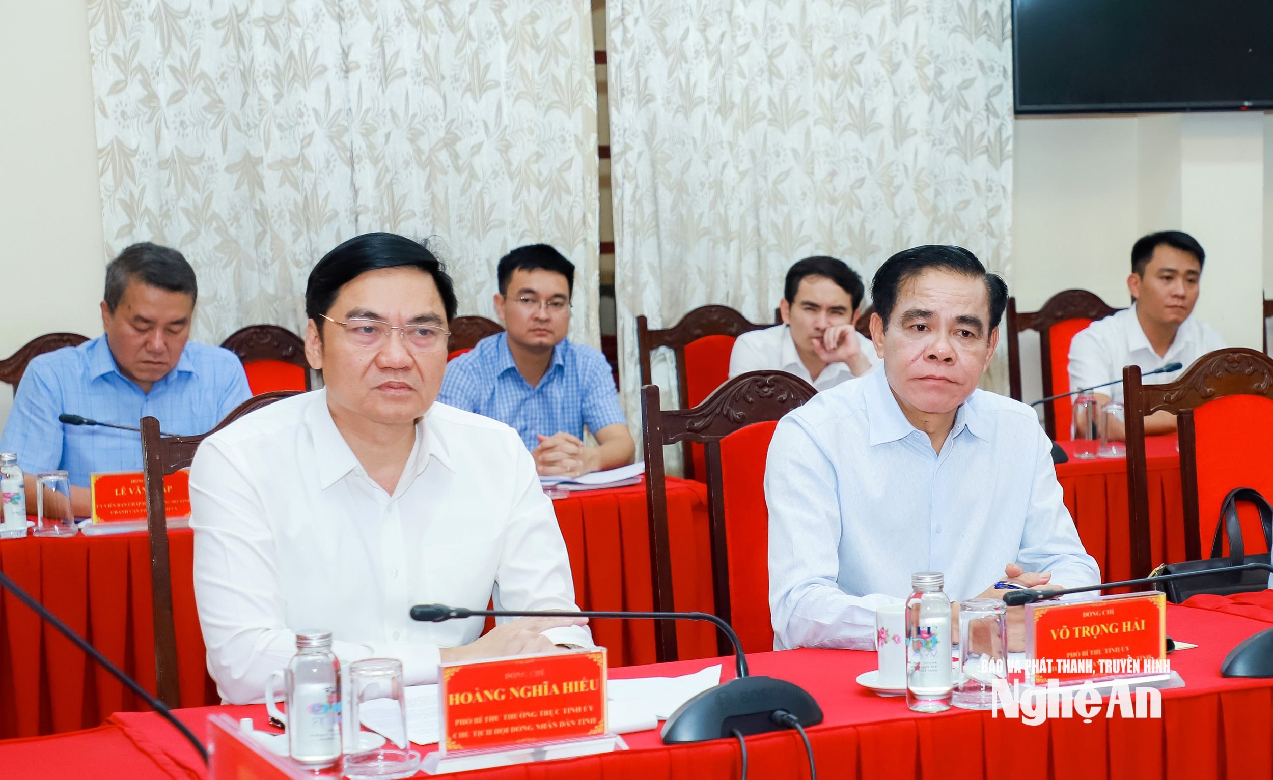 Phát biểu tại hội nghị, thay mặt Ban Thường vụ Tỉnh ủy Nghệ An, đồng chí Hoàng Nghĩa Hiếu - Phó Bí thư Thường trực Tỉnh ủy, Chủ tịch HĐND tỉnh khẳng định, Ban Thường vụ Tỉnh ủy thống nhất cao với báo cáo kết luận của đoàn kiểm tra; đồng thời trân trọng cảm ơn những đánh giá khách quan, toàn diện và các định hướng sâu sát của đồng chí Trưởng đoàn và đoàn.