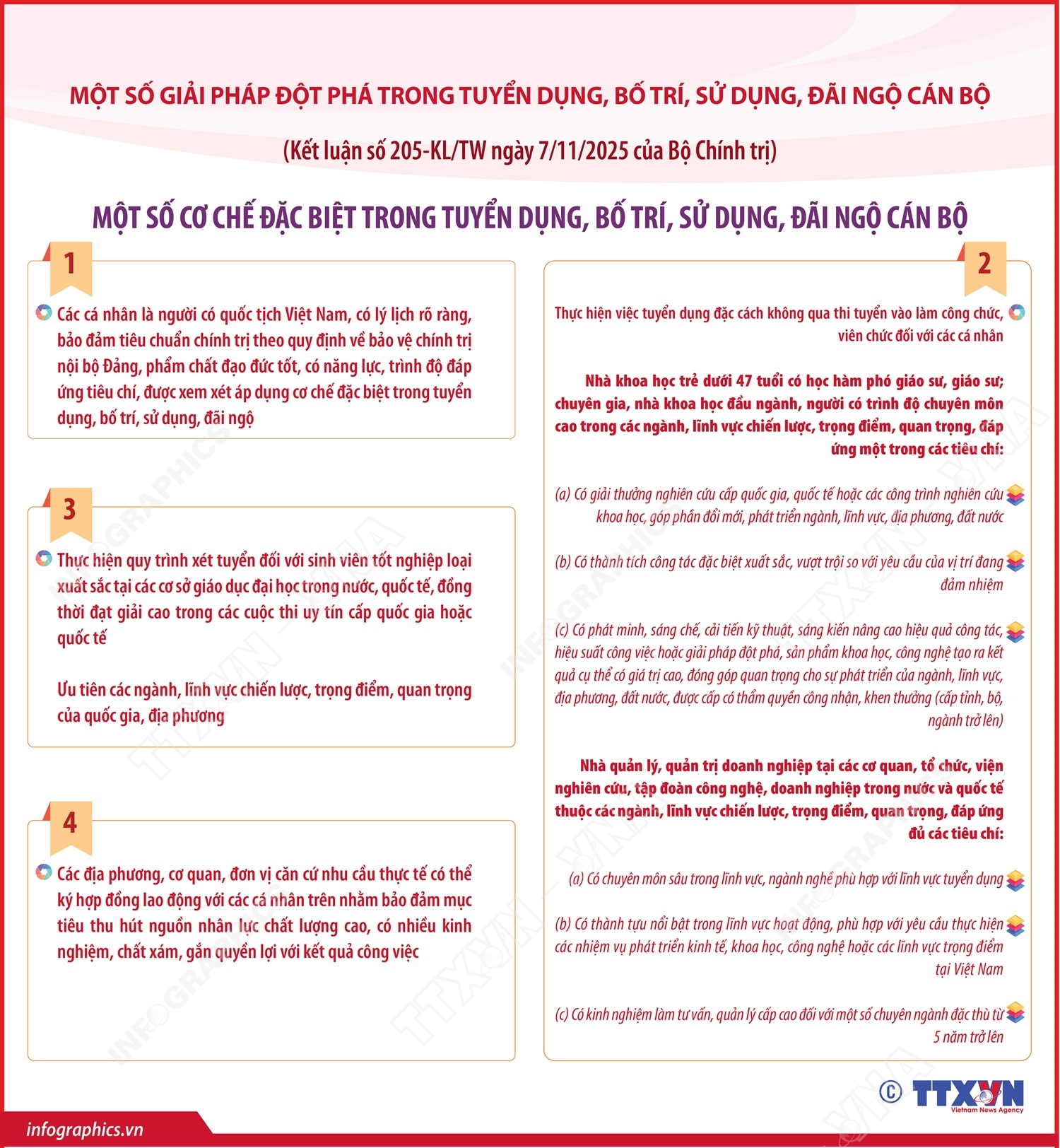 Kết luận số 205 nêu: Xem xét báo cáo của Ban Tổ chức Trung ương về Đề án "Quy định một số cơ chế đặc biệt trong tuyển dụng, bố trí, sử dụng, đãi ngộ cán bộ" và ý kiến của các cơ quan liên quan, Bộ Chính trị kết luận như sau: Để tiếp tục thực hiện thành công đường lối đổi mới; khơi dậy tinh thần yêu nước, ý chí tự cường dân tộc và khát vọng phát triển đất nước hùng cường, thịnh vượng, hạnh phúc, Bộ Chính trị yêu cầu các cấp ủy, tổ chức đảng thực hiện tốt một số giải pháp xây dựng cơ chế, chính sách đột phá, vượt trội nhằm thu hút, tuyển dụng, bố trí, sử dụng, đãi ngộ đối với những cán bộ thực sự tài năng, xuất sắc, đáp ứng yêu cầu phát triển đất nước trong kỷ nguyên mới. Kết luận này có hiệu lực từ thời điểm ban hành và được phổ biến tới chi bộ.