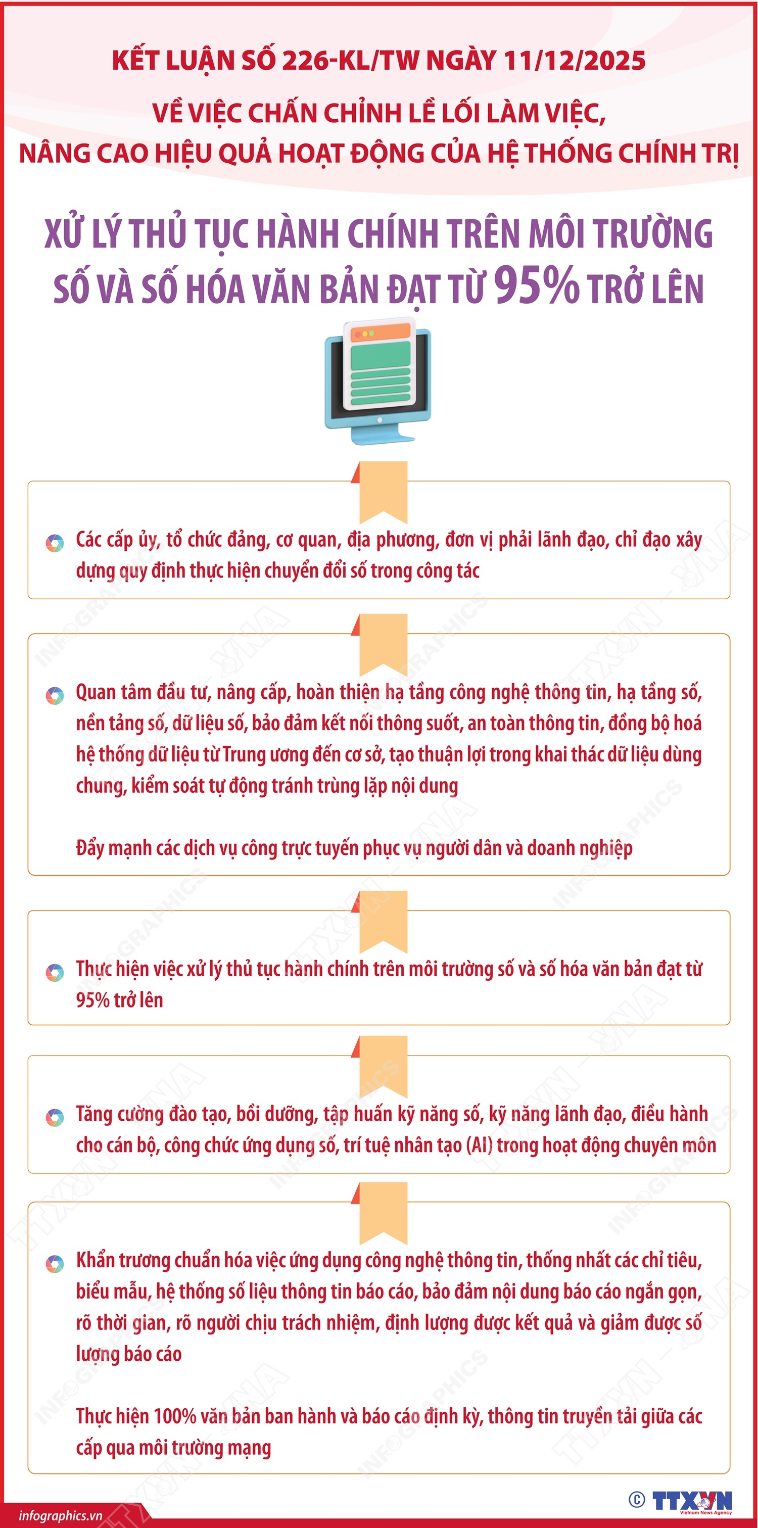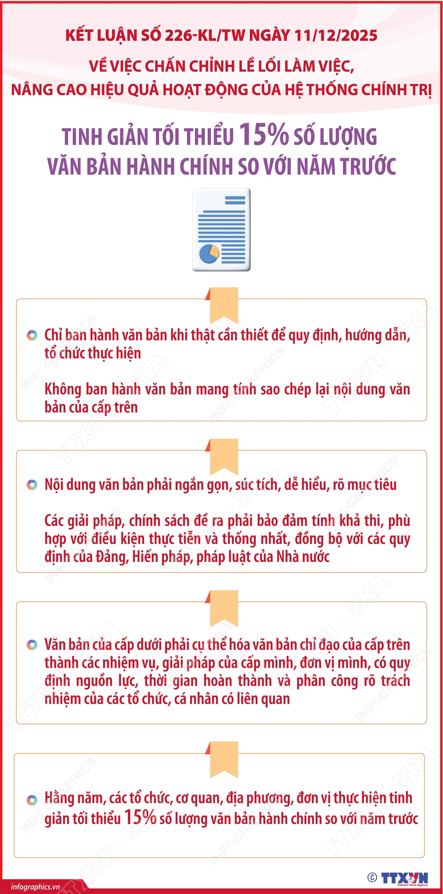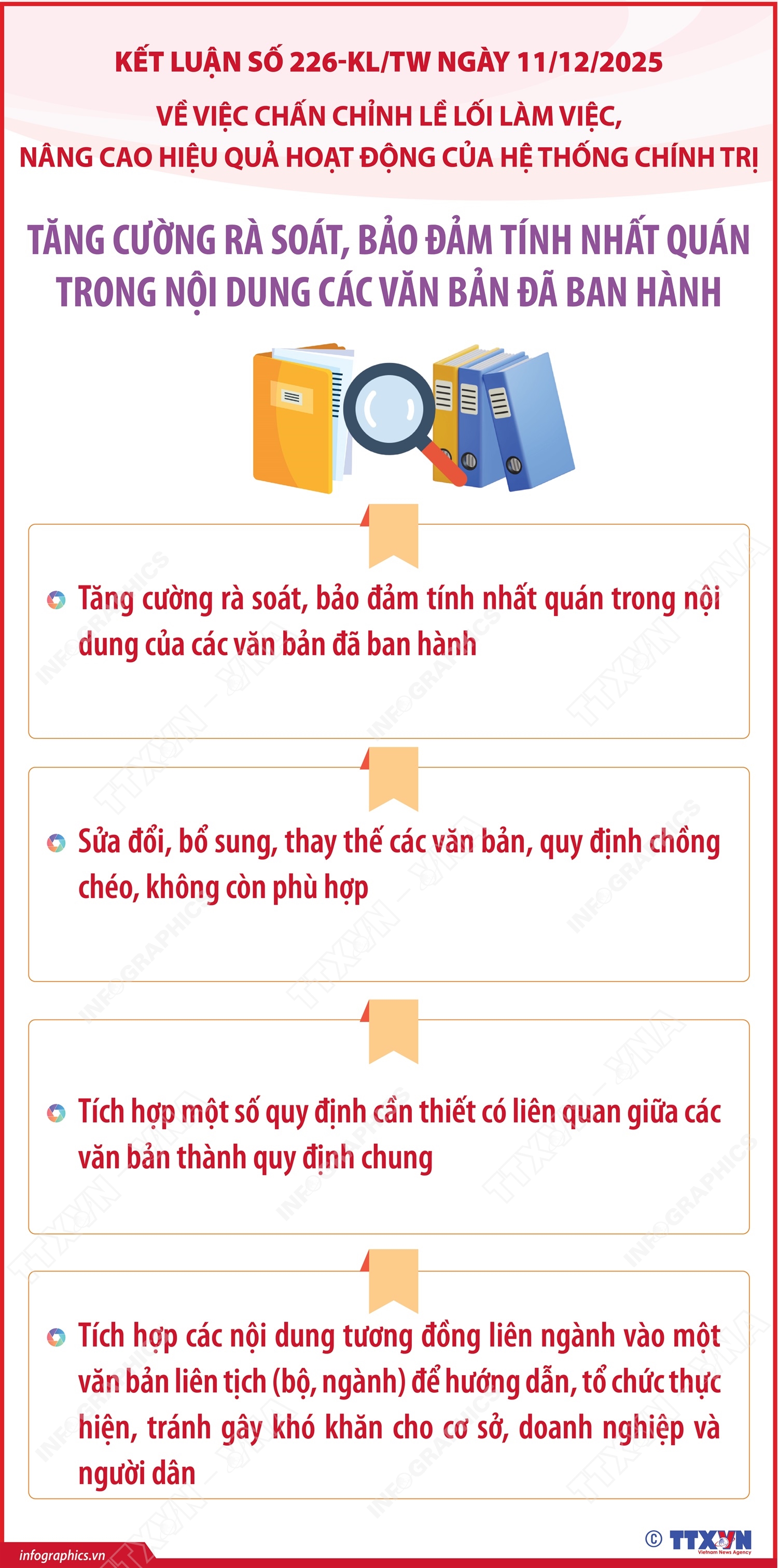 Về công tác ban hành văn bản, Kết luận số 226-KL/TW nêu rõ: Tập trung đổi mới, nâng cao chất lượng công tác ban hành văn bản theo hướng đơn giản hóa và rút gọn, tích hợp các quy trình, thủ tục trong ban hành văn bản. Không ban hành văn bản thuộc thẩm quyền riêng thay cho văn bản thuộc thẩm quyền chung của tổ chức, cơ quan, địa phương, đơn vị. Không đưa nội dung về công tác cán bộ, chế độ, chính sách vào văn bản quy định về chuyên môn, nghiệp vụ. Bảo đảm các văn bản được ban hành đúng thẩm quyền, đúng thể thức, kỹ thuật trình bày.