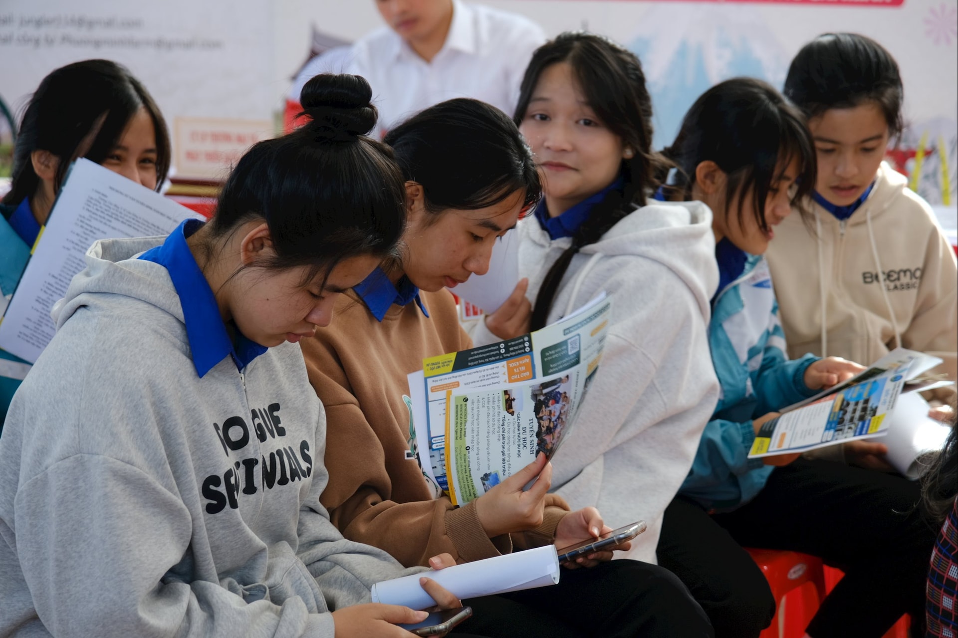 Tại phiên chợ việc làm, các em học sinh được cung cấp thông tin về các thị trường lao động và du học nghề tại Đức, Nhật Bản, Hàn Quốc