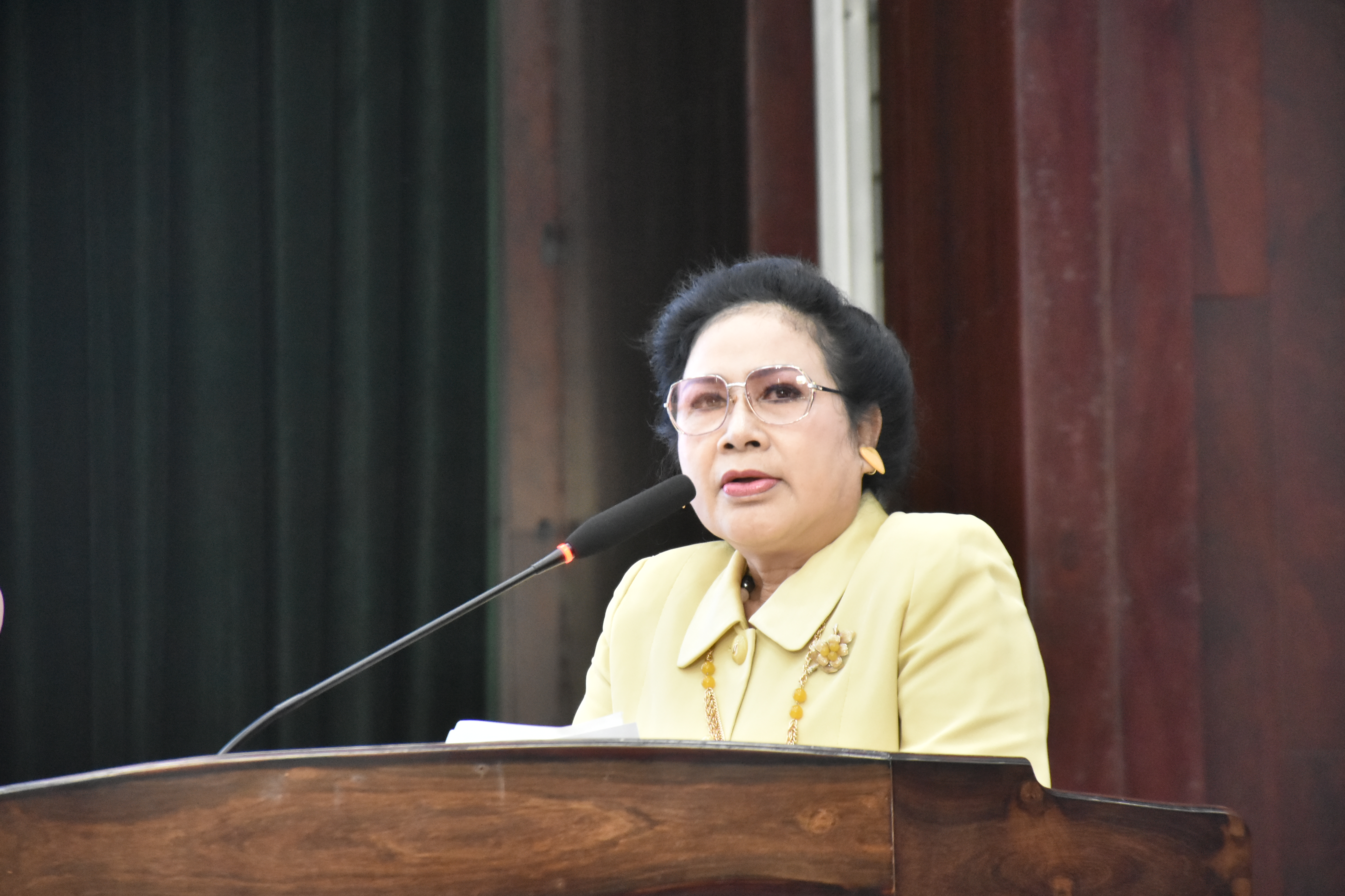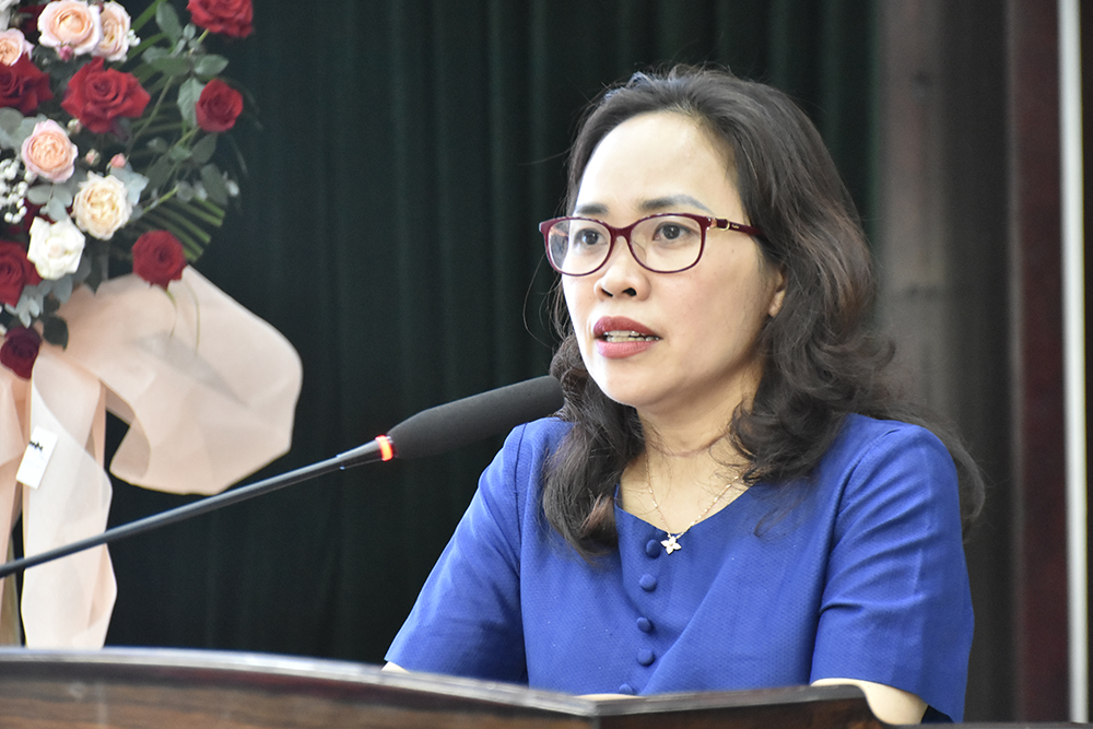 Bà Vũ Thị Minh Ngọc, Trưởng phòng Hạ tầng Thương mại - Cục Quản lý và Phát triển thị trường trong nước (Bộ Công thương) phát biểu tham luận về tổng quan hạ tầng thương mại biên giới Việt Nam - Campuchia, thực trạng và định hướng