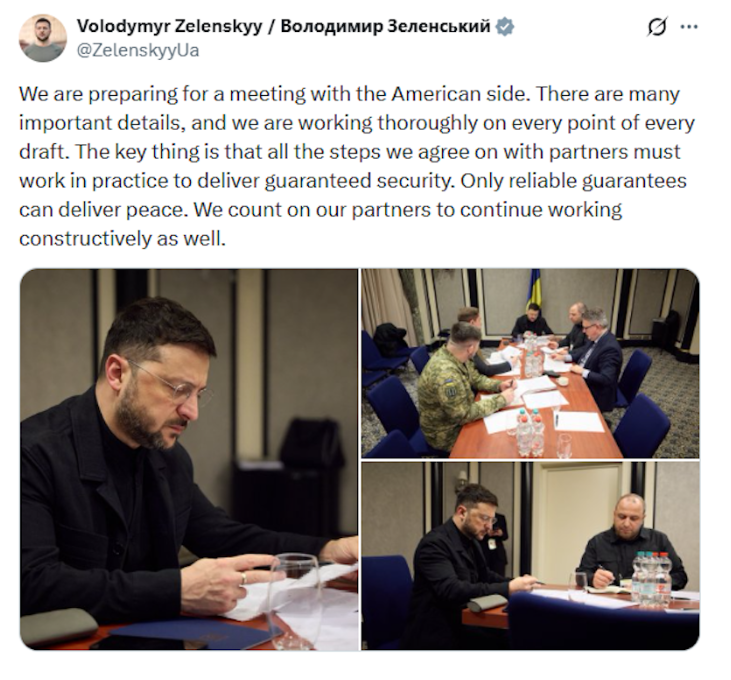 Phía Mỹ cho biết các bên đang tiến gần tới một thỏa thuận về bảo đảm an ninh, dự kiến dựa trên tinh thần Điều 5 của Tổ chức Hiệp ước Bắc Đại Tây Dương (NATO) - điều khoản coi một cuộc tấn công vào một nước thành viên là tấn công vào toàn khối. Nếu được hiện thực hóa, đây sẽ là gói bảo đảm an ninh mạnh mẽ nhất từng được đưa ra cho Ukraine kể từ khi xung đột nổ ra.