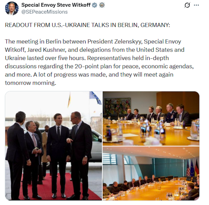 Bài đăng của đặc phái viên Mỹ Steve Witkoff sau ngày làm việc đầu tiên cho biết, các bên đã đạt được nhiều tiến triển trong thỏa thuận hòa bình 20 điểm.
