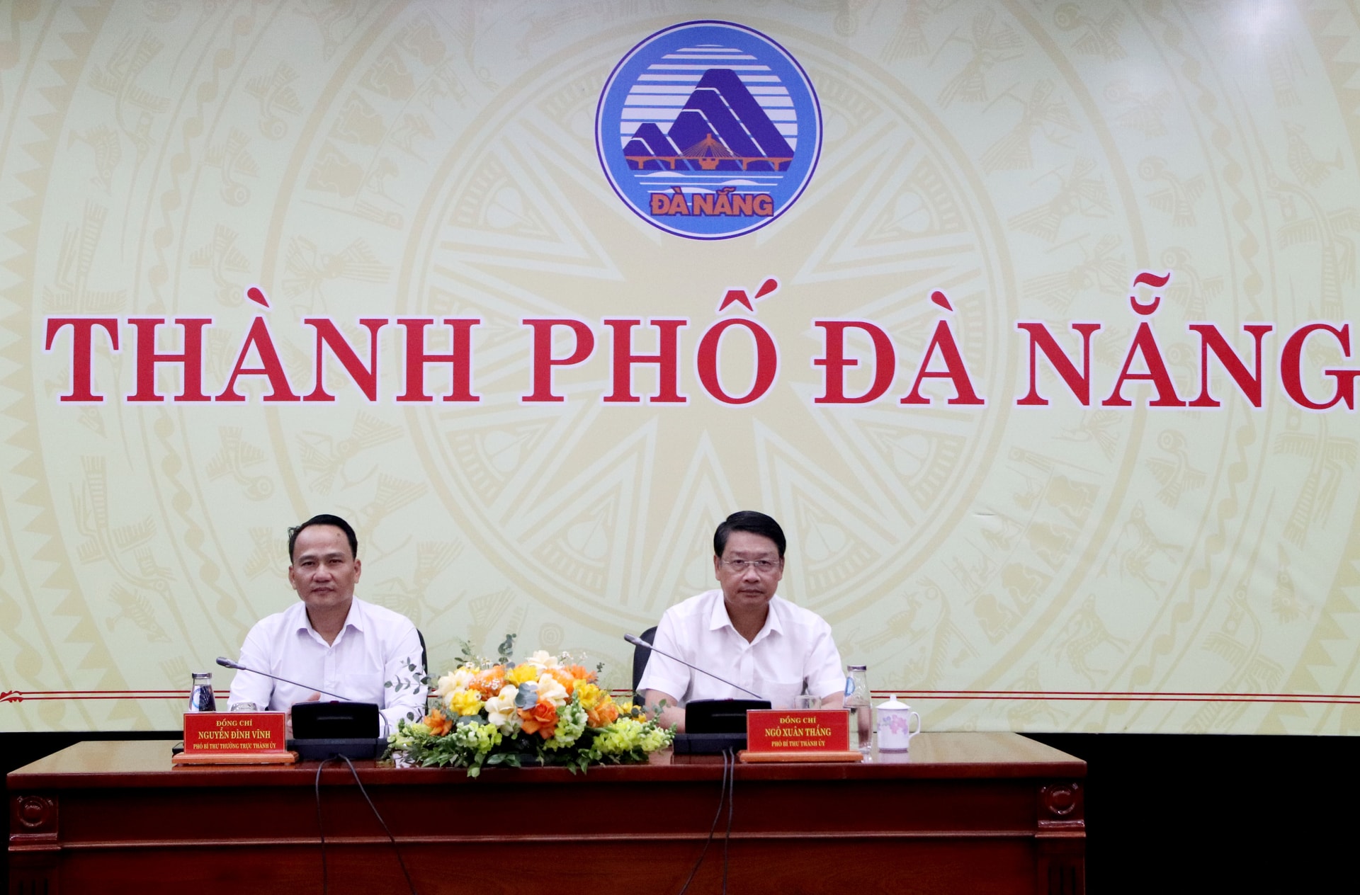 Phó Bí thư Thường trực Thành ủy Nguyễn Đình Vĩnh và Phó Bí thư Thành ủy Ngô Xuân Thắng chủ trì tại điểm cầu Đà Nẵng. Ảnh: TRỌNG HUY