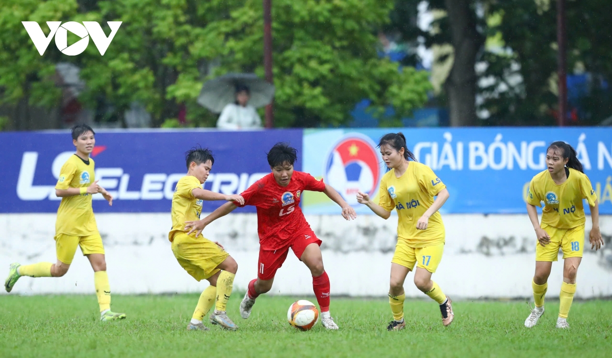 Hoàng Thị Loan bên phía Hà Nội trong một tình huống tranh chấp với cầu thủ đội bạn.