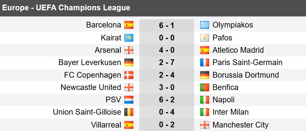 Kết quả Cúp C1 châu Âu hôm nay 22/10, các đội bóng lớn như PSG, Barca, Inter hay Arsenal đều giành được những trận thắng đậm. Arsenal dù gặp khó khăn trong hiệp 1 nhưng vẫn giành thắng lợi 4-0 trước Atletico nhờ 4 bàn thắng được ghi trong hiệp 2.
