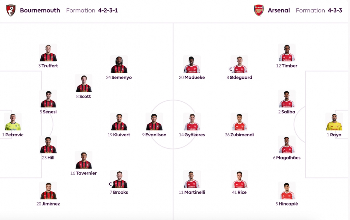 Arsenal (4-3-3): Raya - Timber, Saliba, Gabriel, Lewis-Skelly - Odegaard, Zubimendi, Rice - Saka, Jesus, Trossard