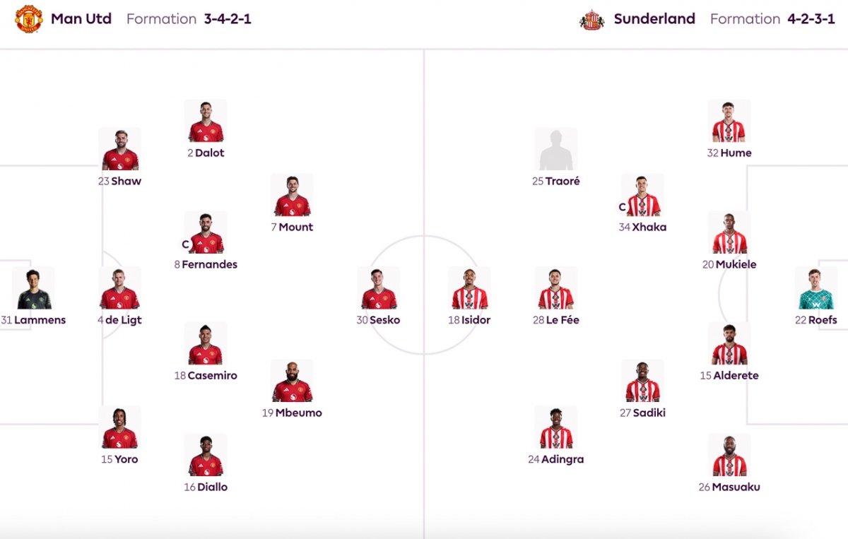 Đội hình xuất phát trận đấu MU vs Sunderland.