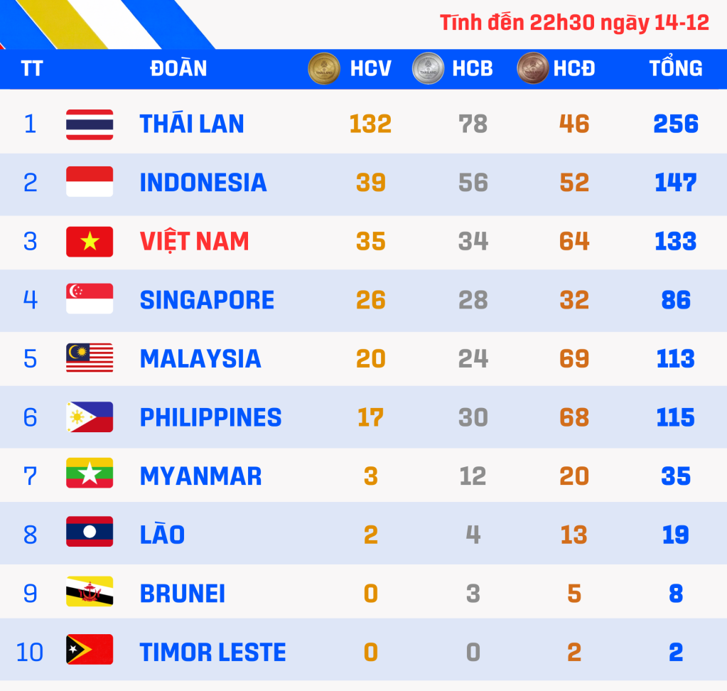 Bảng xếp hạng huy chương SEA Games 2025 ngày 14/12 (cập nhật đến 22h30')