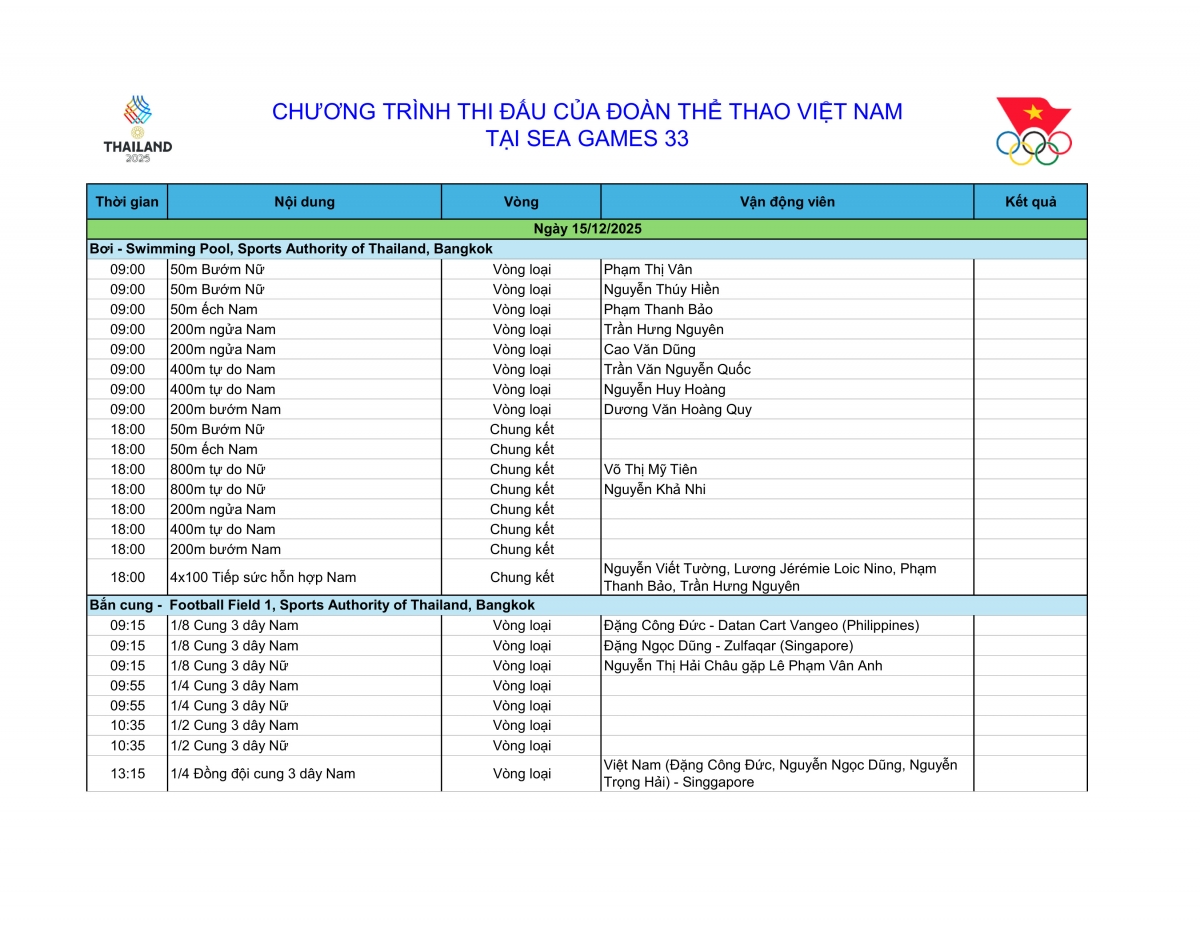 Lịch thi đấu của Đoàn Thể thao Việt Nam tại SEA Games 33 ngày 15/12