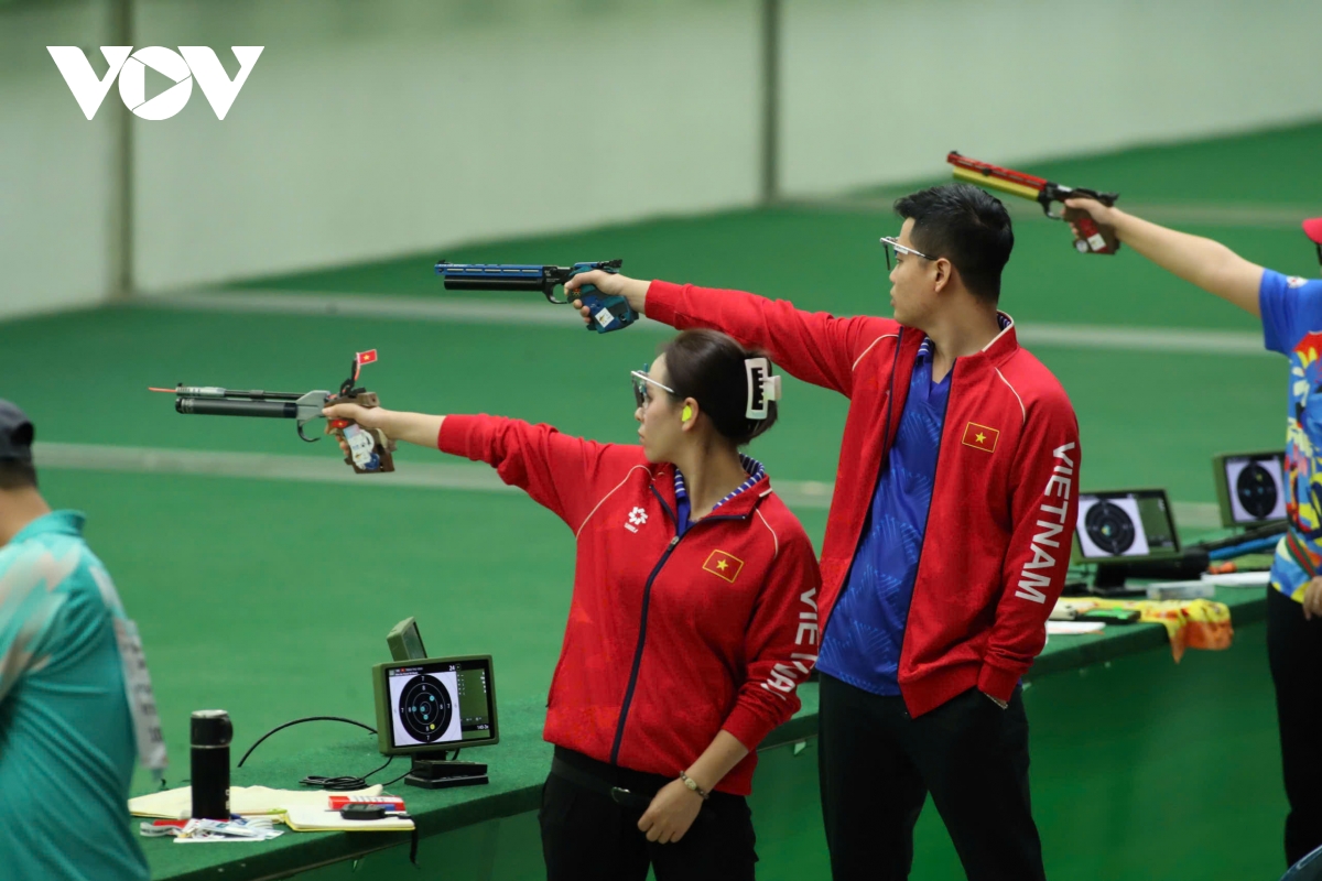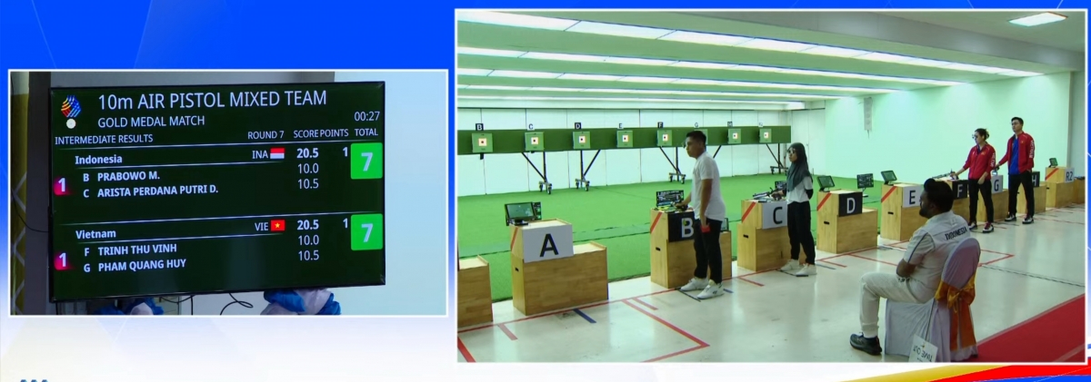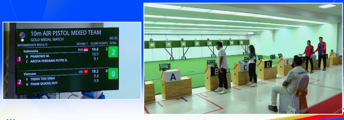Phạm Quang Huy và Trịnh Thu Vinh thi chung kết 10m súng ngắn đồng đội hỗn hợp với đối thủ Indonesia.