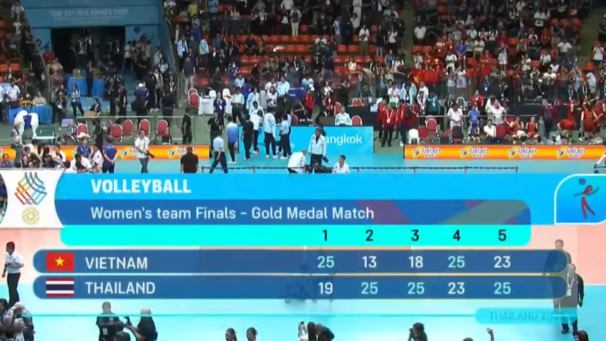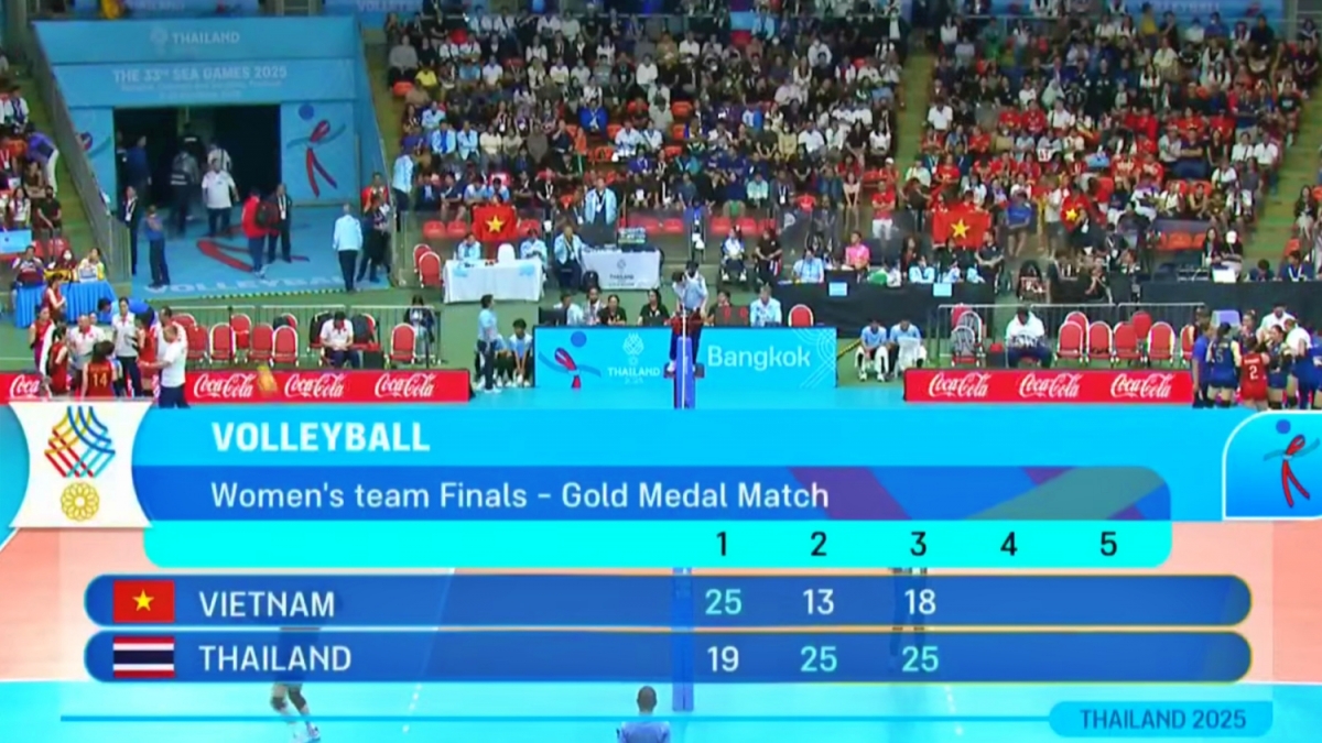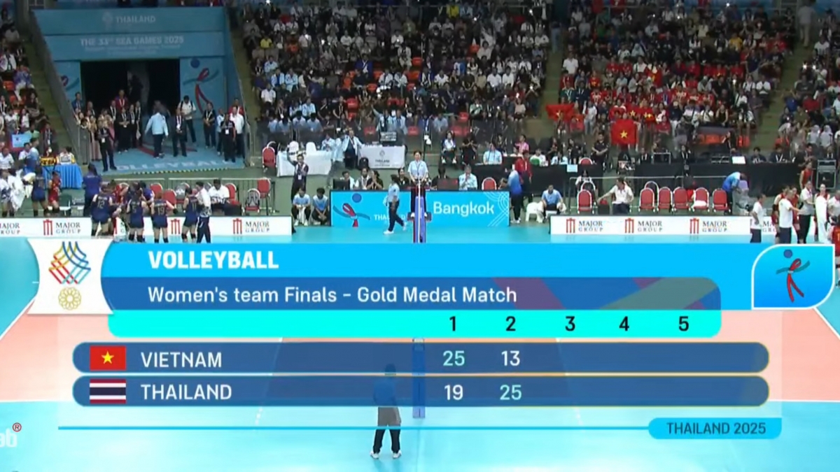 BÓNG CHUYỀN NỮ: Trong trận chung kết, đội tuyển bóng chuyền nữ Việt Nam thắng set 1 trước đội tuyển bóng chuyền nữ Thái Lan với điểm số 25-19.