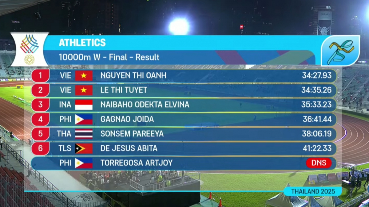 ĐIỀN KINH: Nguyễn Thị Oanh giành HCV ở nội dung chạy 10000m nữ với thành tích 34 phút 27 giây 93. Người giành HCB là Lê Thị Tuyết cũng của Việt Nam.