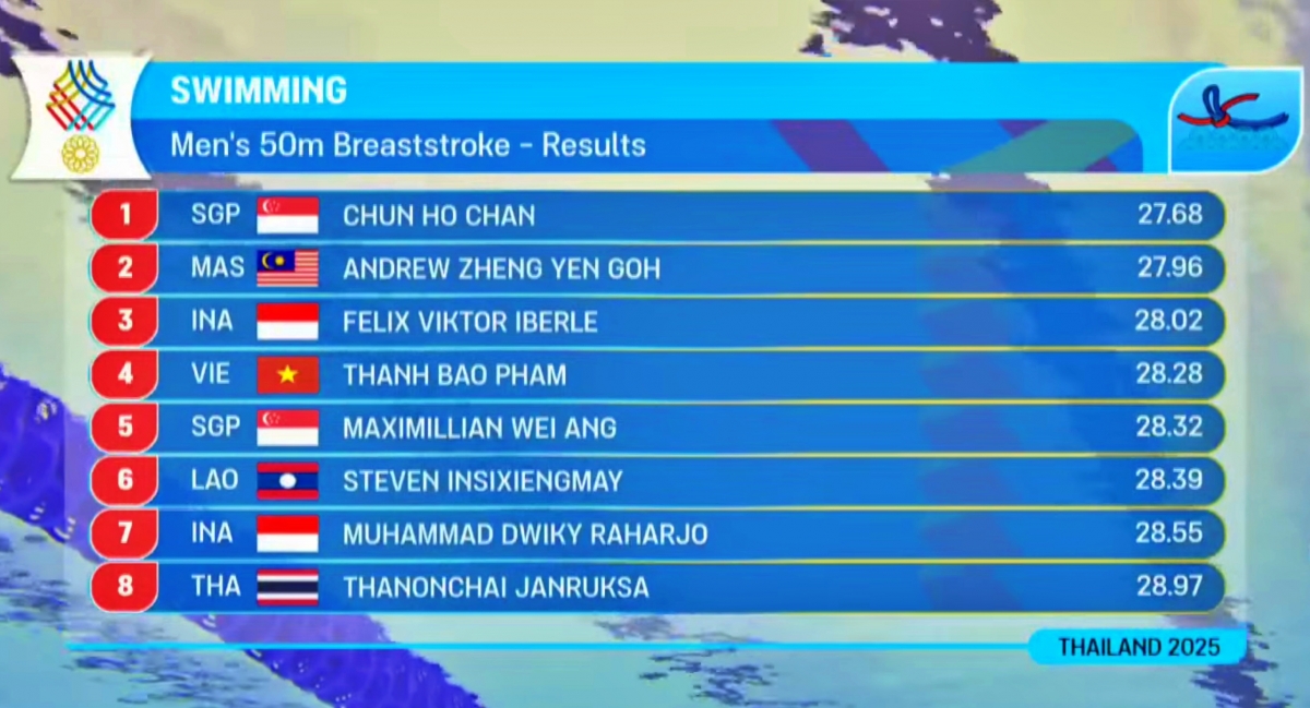 MÔN BƠI: Phạm Thanh Bảo giành quyền vào bơi chung kết nội dung 50m ếch. Tại vòng loại thành tích của vận động viên Việt Nam là 28 giây 38, đứng thứ 4 trong số 8 vận động viên vào thi chung kết.