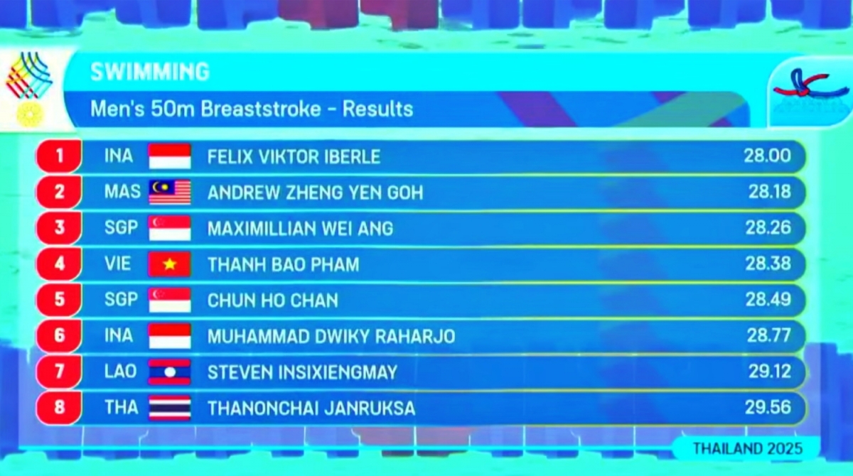 MÔN BƠI: Phạm Thanh Bảo chỉ về đích ở vị trí thứ 4 tại nội dung chung kết 50m bơi ếch nam nên không giành được huy chương.