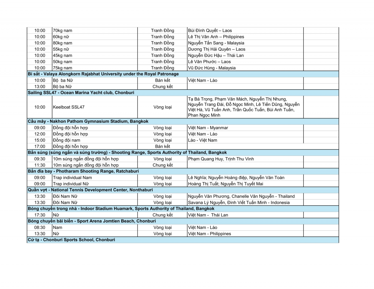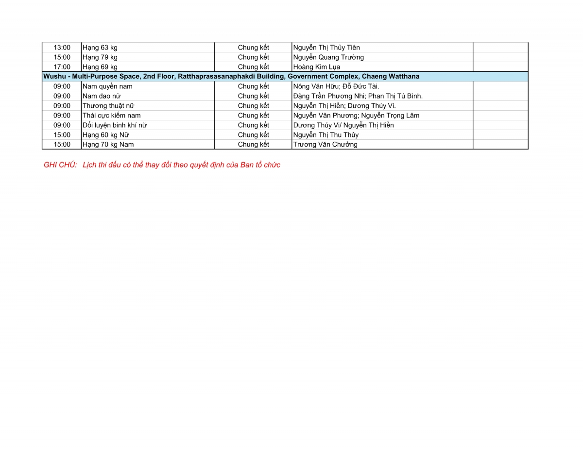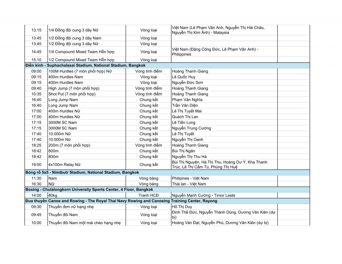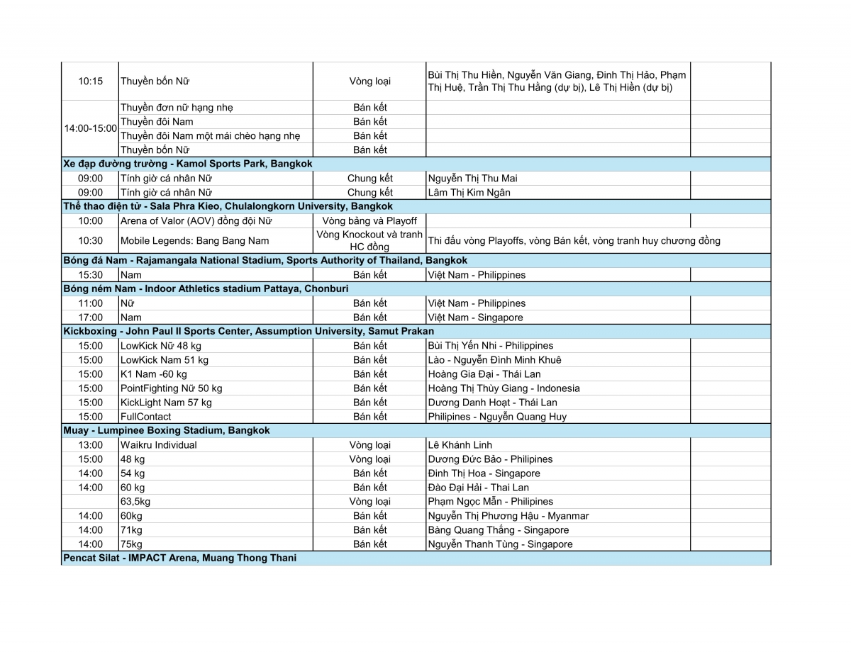 WUSHU: Trong sáng nay (15/12), các vận động viên của Việt Nam sẽ thi chung kết Nam quyền nam (Nông Văn Hữu, Đỗ Đức Tài); Nam đạo nữ (Đặng Trần Phương Nhi, Phan Thị Tú Bình); Thương thuật nữ (Nguyễn Thị Hiền, Dương Thúy Vi), Thái cực kiếm (Nguyễn Văn Phương, Nguyễn Trọng Lâm); Đối luyện binh khí nữ (Dương Thúy Vi/Nguyễn Thị Hiền).
