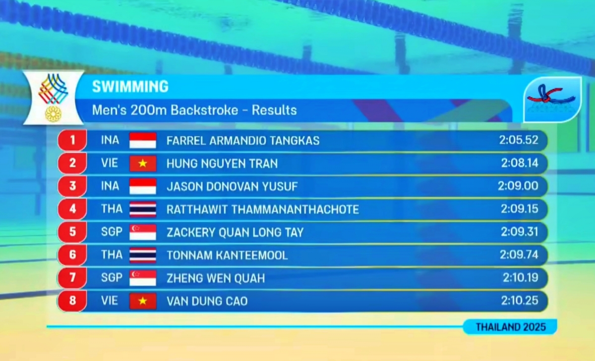 MÔN BƠI: Ở nội dung bơi vòng loại 200m ngửa nam, hai vận động viên của Việt Nam là Trần Hưng Nguyên và Cao Văn Dũng đều lọt vào thi chung kết vào tối nay. Thành tích của Trần Hưng Nguyên là 2 phút 08 giây 14. Trong khi đó, Cao Văn Dũng đạt thành tích 2 phút 10 giây 25.