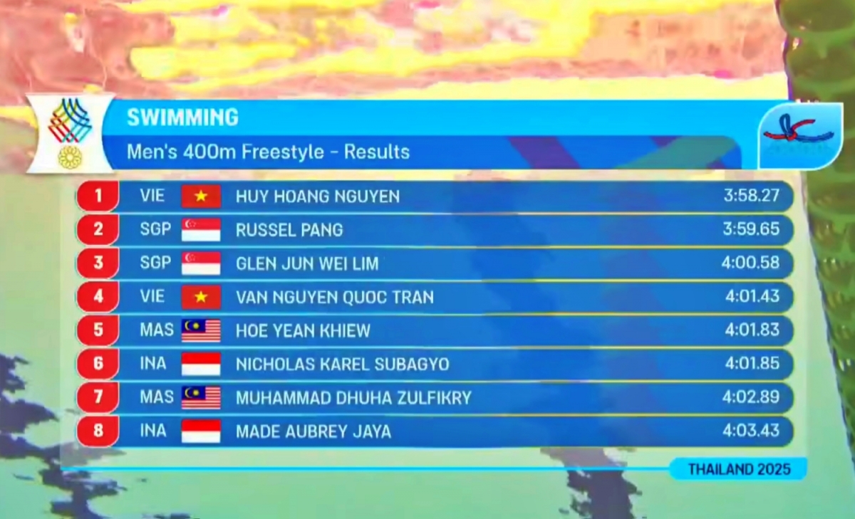 Trần Văn Nguyễn Quốc giành HCB ở nội dung bơi 400m tự do nam, trong khi Huy Hoàng giành HCĐ. Vận động viên giành HCV ở nội dung này là của Malaysia.