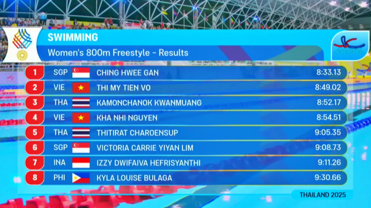 MÔN BƠI: Võ Thị Mỹ Tiên giành HCB ở nội dung 800m bơi tự do nữ với thành tích 8 phút 49 giây 02. Vận động viên còn lại của Việt Nam là Nguyễn Khả Nhi về đích thứ 4 với thành tích 8 phút 54 giây 51.