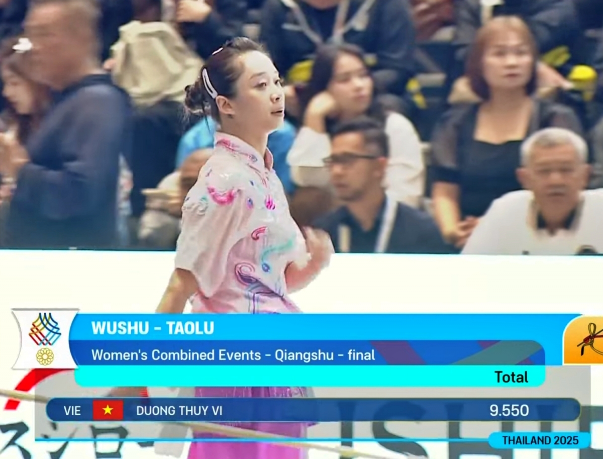 MÔN WUSHU: Tại nội dung thi chung kết Thương thuật nữ, Dương Thúy Vi của Việt Nam đạt số điểm 9.550.