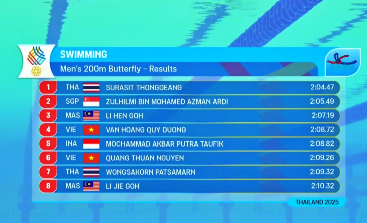 Dương Văn Hoàng Quy giành HCB, Nguyễn Quang Thuấn giành HCĐ ở nội dung bơi 200m bướm na.