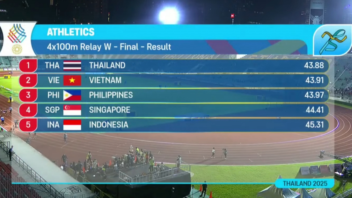 Việt Nam giành HCB nội dung 4x100m tiếp sức nữ, đứng sau đội chạy tiếp sức của Thái Lan.