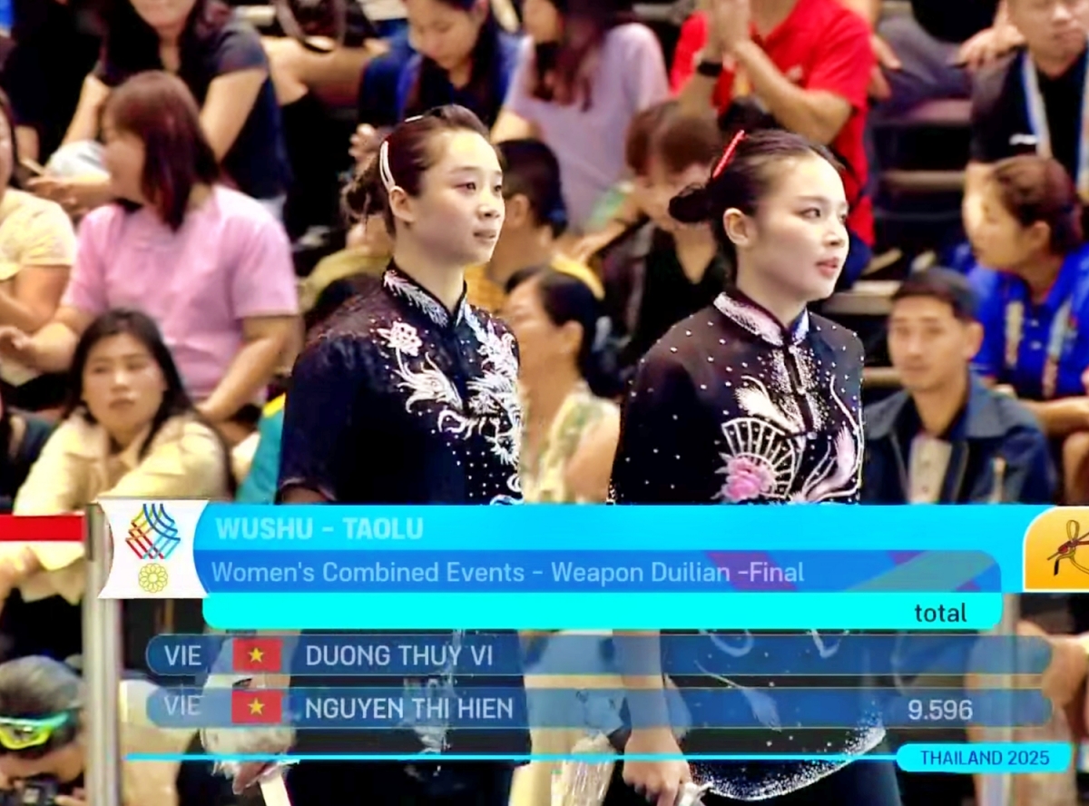 WUSHU: Bài thi Đối luyện binh khí nữ, Dương Thúy Vi và Nguyễn Thị Hiền đạt số điểm 9.596.
