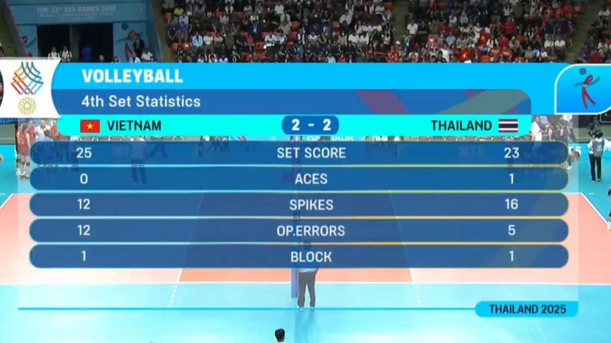 BÓNG CHUYỀN: Trong set 2, đội tuyển bóng chuyền nữ Việt Nam thua 13-25 trước Thái Lan. Tỉ số của trận chung kết đang là 1-1.