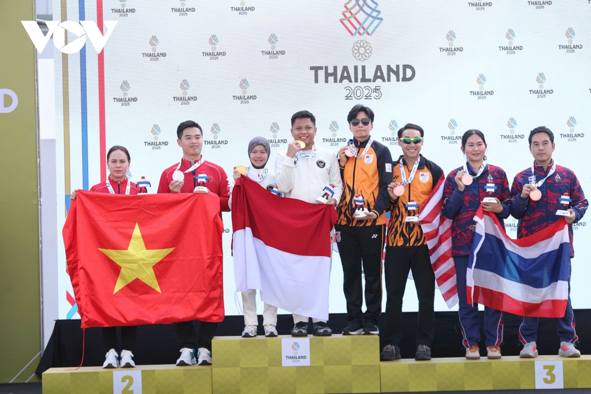 BẮN SÚNG: Thu Vinh và Quang Huy chỉ giành HCB ở nội dung 10m súng ngắn đồng đội hỗn hợp khi thua 9-17 trước 2 vận động viên người Indonesia. Trong trận chung kết, Thu Vinh và Quang Huy chơi tốt, nhưng đối thủ bắn quá xuất sắc nên hai vận động viên của Việt Nam không thể giành HCV.
