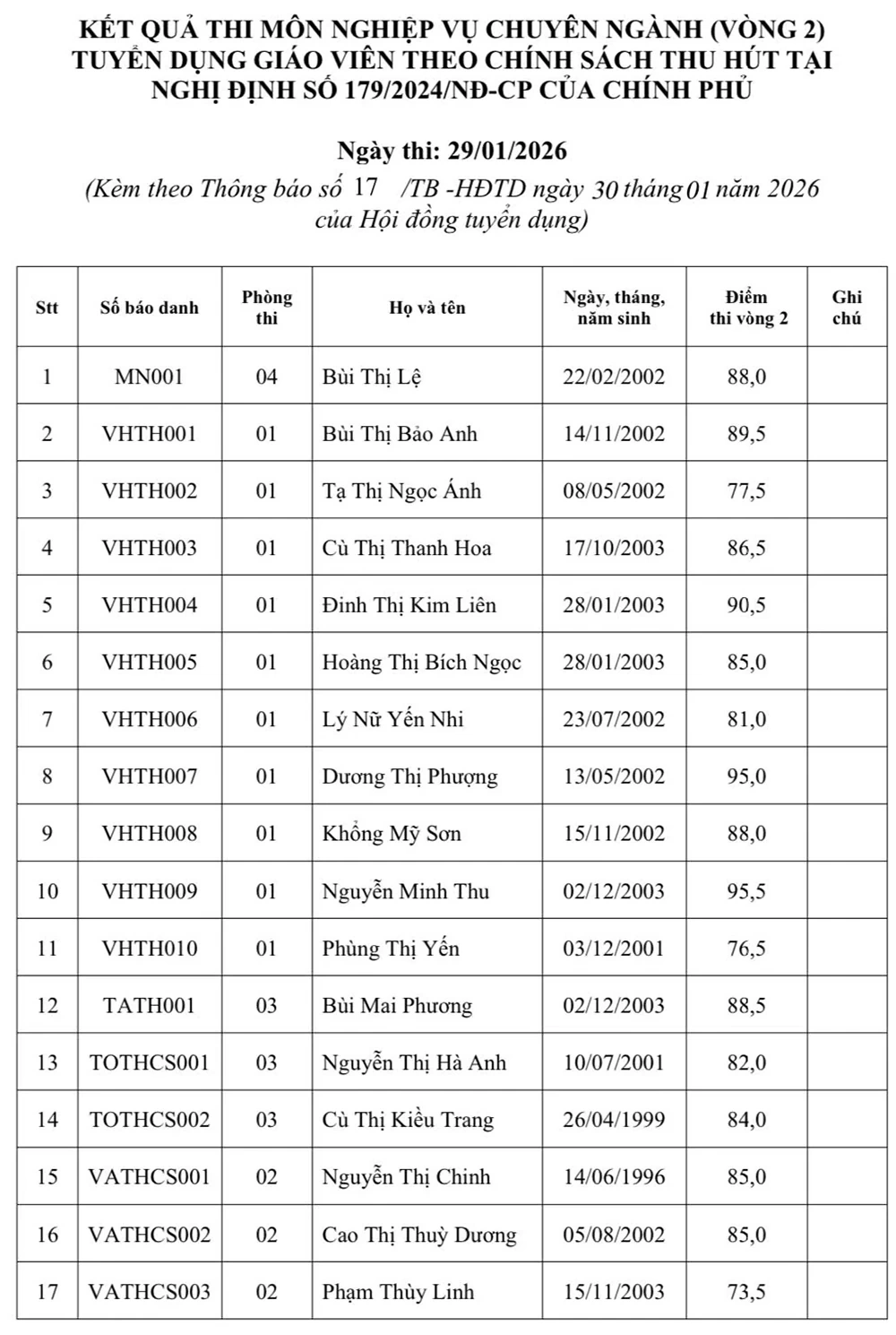 Theo thông báo của Hội đồng tuyển dụng, có 32 thí sinh thi môn nghiệp vụ chuyên ngành (vòng 2) tuyển dụng giáo viên theo chính sách thu hút quy định tại Nghị định số 179/2024/NĐ-CP. Kết quả cho thấy, nhiều thí sinh đạt điểm số cao, trong đó có thí sinh đạt 96 điểm. Một thí sinh vắng thi.