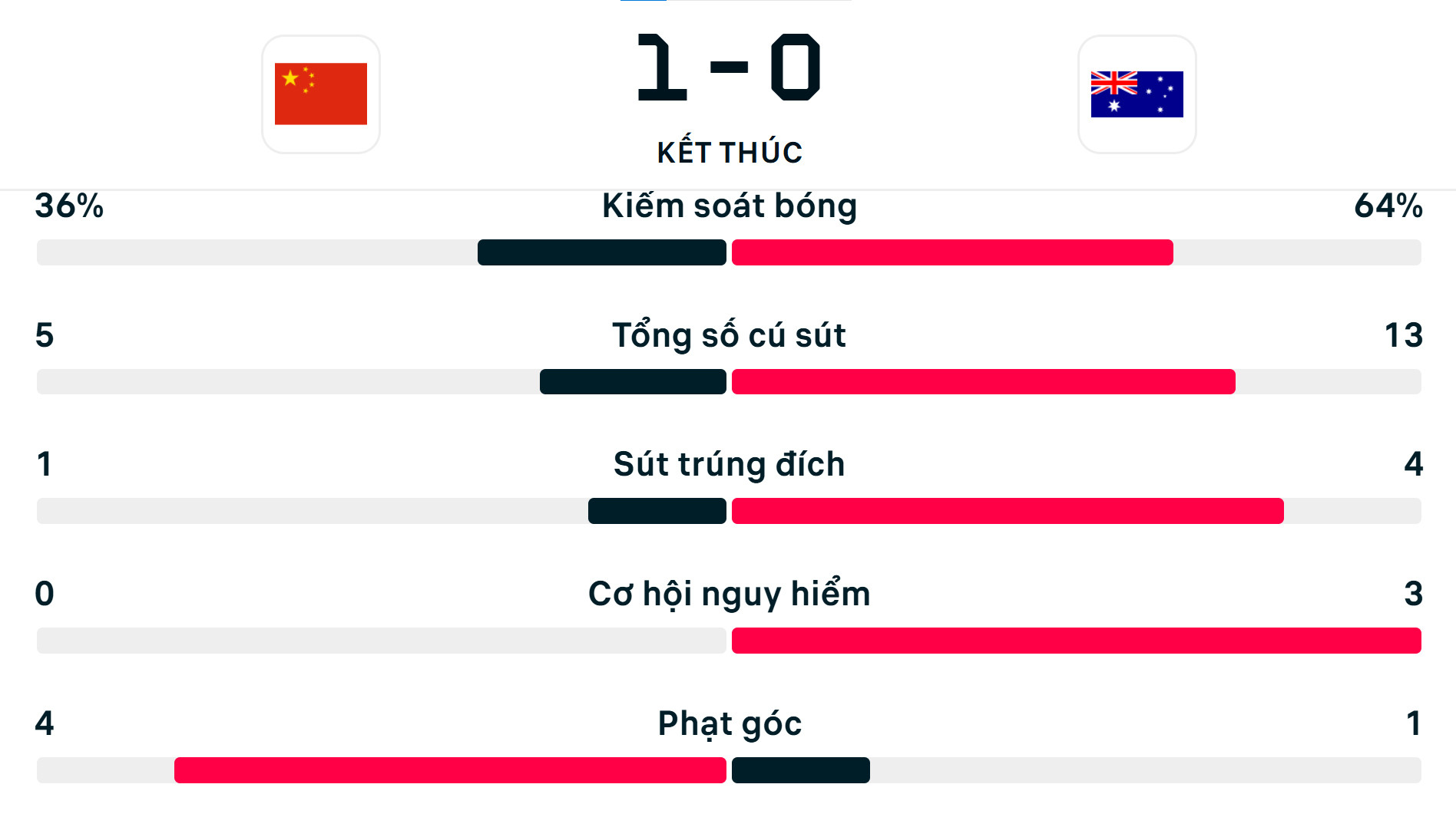 Số liệu thống kê U23 Trung Quốc 1-0 U23 Australia.