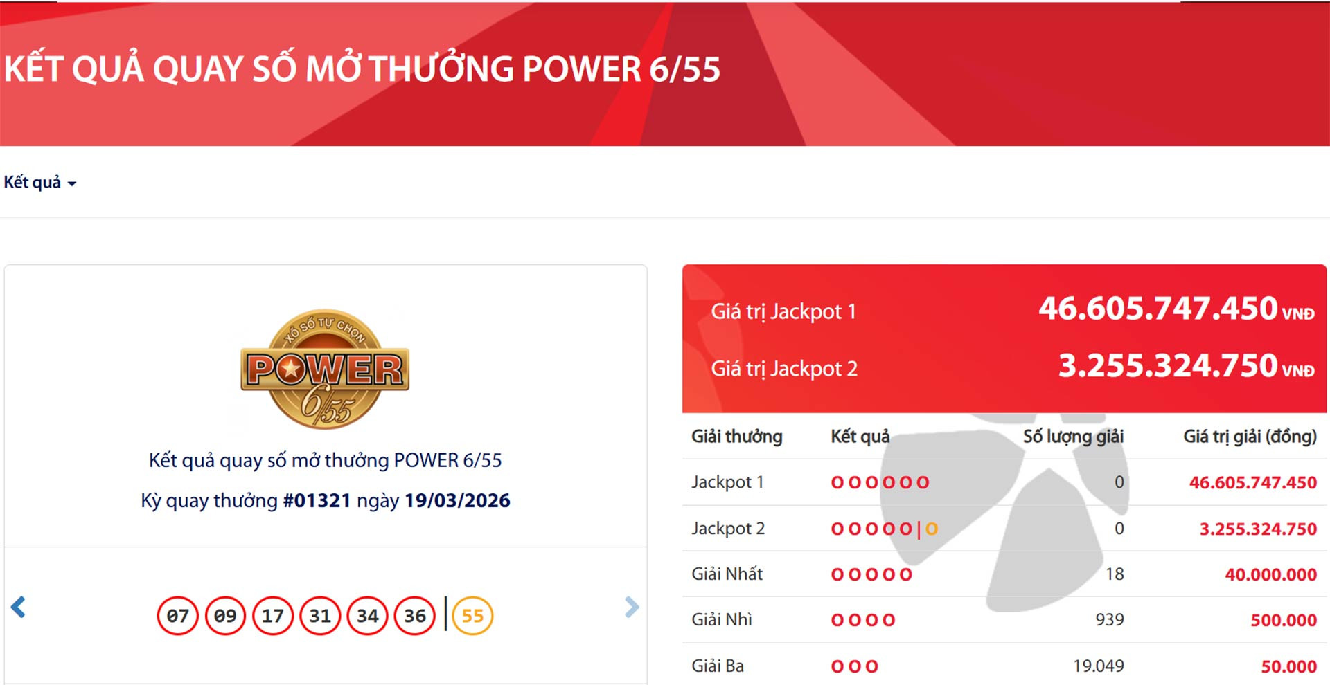Công ty Xổ số Điện toán Việt Nam (Vietlott) thông tin, ở kỳ quay số mở thưởng lần thứ 1.321 của loại hình xổ số Power 6/55 diễn ra tối nay (19/3), hội đồng quay thưởng của Vietlott xác định giá trị của giải độc đắc Jackpot 1 là 46.605.747.450 đồng (hơn 46,6 tỷ đồng) và giá trị của giải độc đắc Jackpot 2 là 3.255.324.750 đồng (gần 3,3 tỷ đồng).
