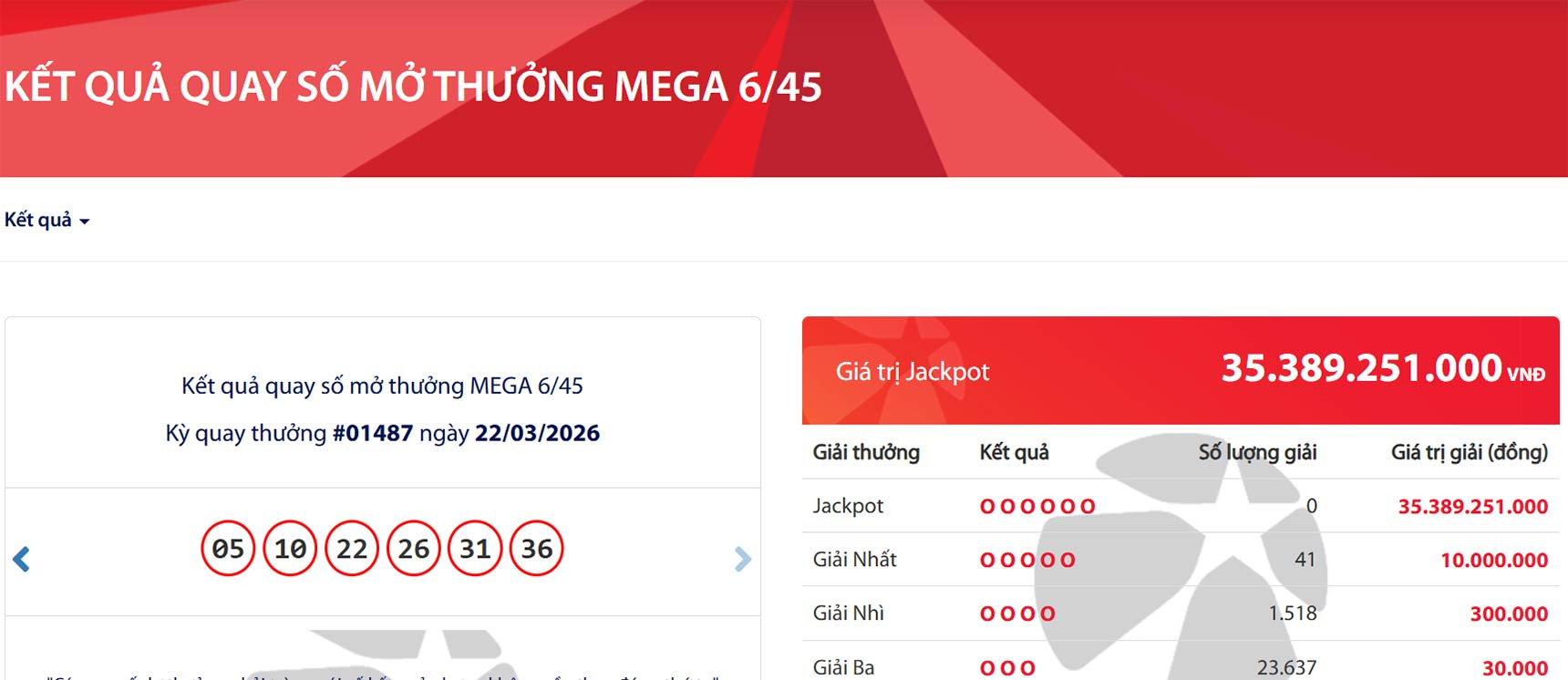 Công ty Xổ số Điện toán Việt Nam (Vietlott) cho hay, tại kỳ quay số mở thưởng lần thứ 1.487 của sản phẩm Mega 6/45 diễn ra tối nay (22/3), hội đồng quay thưởng của Vietlott xác định giá trị giải độc đắc Jackpot là 35.389.251.000 đồng (gần 35,4 tỷ đồng).