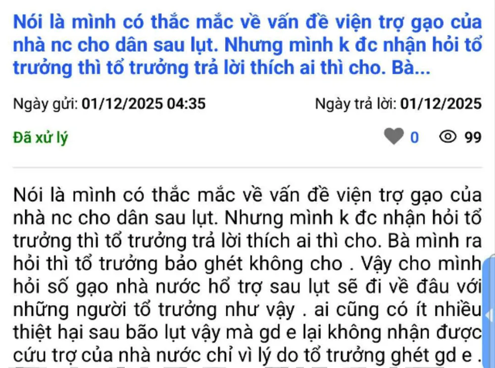 Trước đó, ngày 1-12, một người dân tại TDP 1, phường Vỹ Dạ đã gửi phản ánh đến Trung tâm Điều hành đô thị thông minh Huế (Hue-S). Người này bức xúc cho rằng gia đình mình chịu thiệt hại do bão lũ nhưng không được nhận gạo cứu trợ của nhà nước.