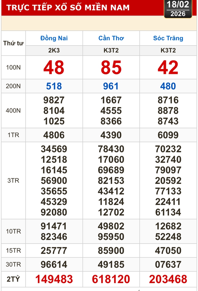 Kết quả xổ số miền Nam, ngày 18-2, sẽ được Báo Người Lao Động cập nhật khi các công ty xổ số kiến thiết công bố kết quả.