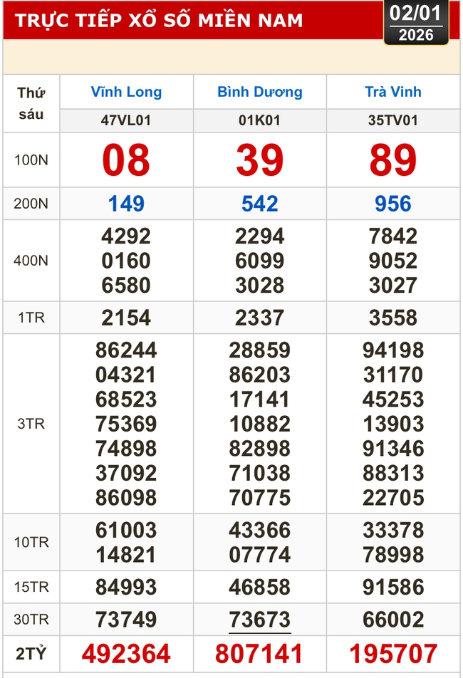 Kết quả xổ số hôm nay của xổ số miền Nam (XSMN): Vĩnh Long, Bình Dương, Trà Vinh