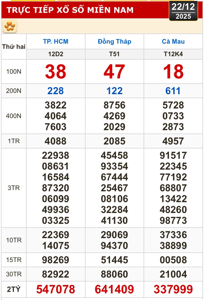 Kết quả xổ số hôm nay ngày 22-12 của xổ số miền Nam (XSMN) công bố vào lúc 16 giờ 30 phút