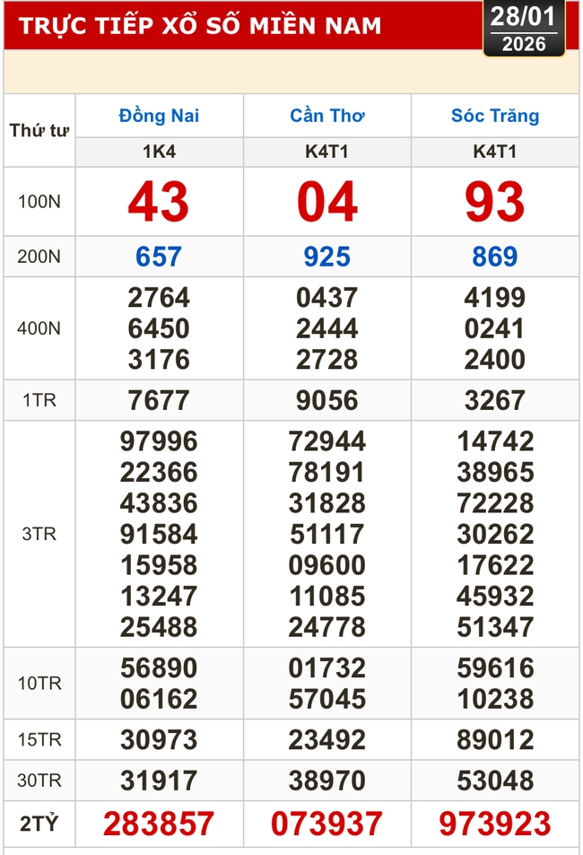 Kết quả xổ số hôm nay của xổ số miền Nam (XSMN): Đồng Nai, Cần Thơ, Sóc Trăng