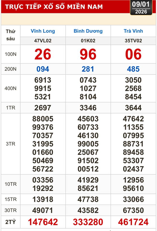 Kết quả xổ số hôm nay của xổ số miền Nam (XSMN): Vĩnh Long, Bình Dương, Trà Vinh