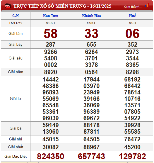 KQXSMT - Kết quả xổ số miền Trung hôm nay Chủ nhật ngày 16/11/2025.