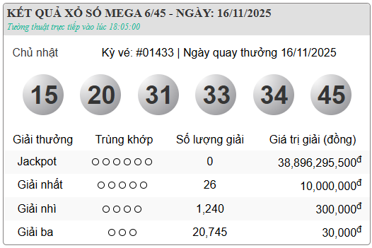 Bên cạnh đó, xổ số Vietlott hôm nay Chủ nhật ngày 16/11/2025 có kết quả như sau: