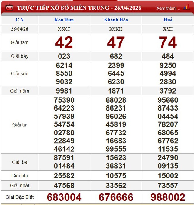 Tiếp theo, xổ số miền Trung hôm nay Chủ nhật ngày 26/4/2026 có kết quả như sau: