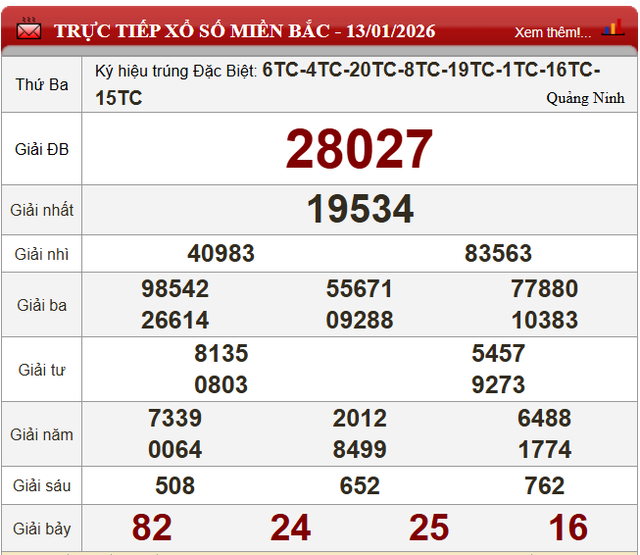 Cuối cùng, xổ số miền Bắc hôm nay thứ Ba ngày 13/1/2026 có kết quả như sau:
