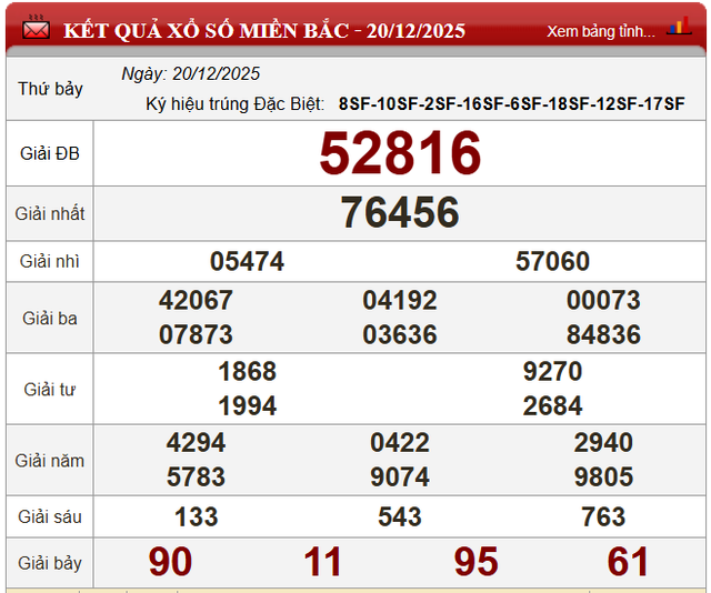 Cuối cùng, xổ số miền Bắc hôm nay thứ Bảy ngày 20/12/2025 có kết quả như sau: