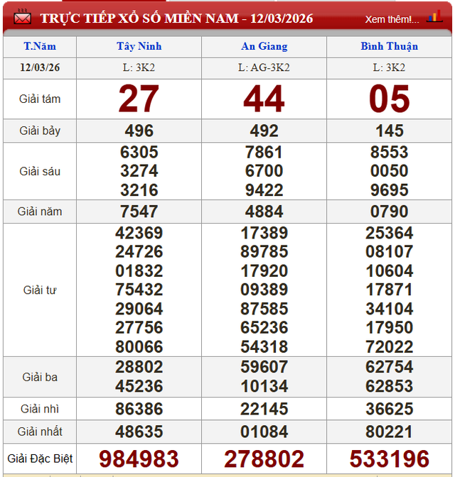 Kết quả xổ số miền Nam ngày 12/3/2026.