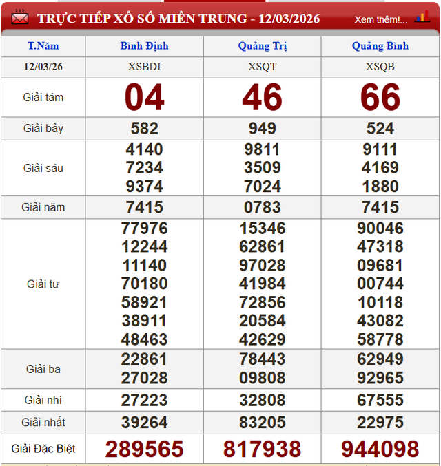 Kết quả xổ số miền Trung ngày 12/3/2026.
