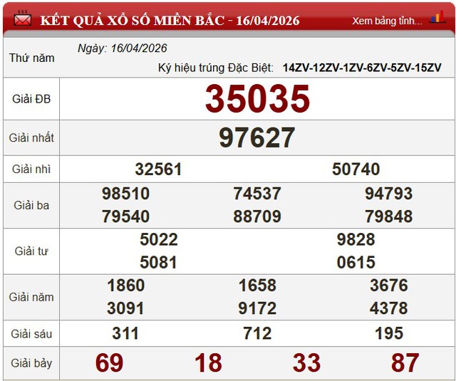 Cuối cùng, xổ số miền Bắc hôm nay thứ Năm ngày 16/4/2026 có kết quả như sau: