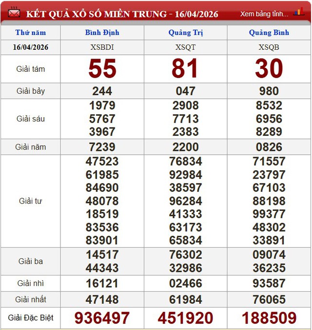 Kết quả xổ số miền Trung ngày 16/4/2026.